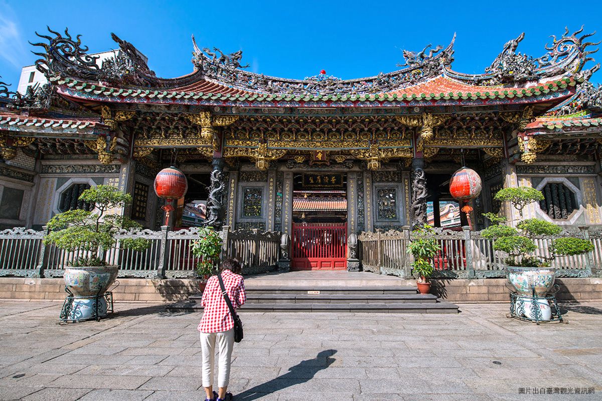 龙山寺坐北朝南,面呈回字形,为中国古典三进四合院之宫殿式建筑,由前殿、正殿、后殿及左右护龙构成。前殿为11开间,分为三川殿、龙门厅、虎门厅。三川殿前有一对全台仅见之铜铸蟠龙柱,正面墙堵则由花岗石与青斗石混合组构而成,墙上故事多出自三国演义和封神榜,富于教育意义。正殿屋顶采歇山重檐式,四面走马廊共42根柱子构成,殿外墙堵留有多幅著名书法家石刻,殿内的螺旋藻井不费一钉一铁,全由斗栱相嵌筑构而成。后殿屋顶采歇山重檐式,为典型儒、道教诸神佛供奉处。左右护龙各配有钟楼与鼓楼,晨钟暮鼓,其轿顶式扁六角形的屋顶,造形独特。全寺屋顶脊带和飞檐由龙凤、麒麟等吉祥物造形,饰以剪黏和交趾陶,色彩瑰丽,堪称台湾剪黏艺术之精华。